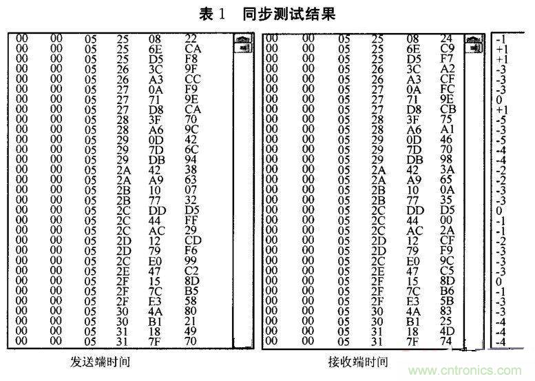 表 1給出了十六進(jìn)制數(shù)據(jù)表示的時(shí)間同步測(cè)試結(jié)果。表中,左邊三個(gè)兩位十六進(jìn)制數(shù)分別表示小時(shí)、分鐘和秒,接著兩個(gè)兩位十六進(jìn)制數(shù)表示毫秒,最右邊的兩位十六 進(jìn)制數(shù)以10微秒為單位。從表中可以看出:當(dāng)同步校正間隔約為1s時(shí),以約100mS的頻度中斷一次進(jìn)行同步測(cè)試,其最大時(shí)間同步誤差為50us。顯然, 時(shí)間同步精度滿足設(shè)計(jì)要求。在時(shí)間同步測(cè)試過(guò)程中還發(fā)現(xiàn):提高同步消息發(fā)送的頻率,網(wǎng)絡(luò)節(jié)點(diǎn)時(shí)間與全網(wǎng)時(shí)間可維持更好的同步。