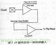 采用這種輸入電路后,由于常規(guī)I/O是三態(tài)的,因此用戶(hù)不必?fù)?dān)心時(shí)鐘進(jìn)入器件。當(dāng)然,增加一級(jí)門(mén)電路會(huì)產(chǎn)生0.6ns的較大時(shí)鐘延時(shí),幸好這在多數(shù)低功率設(shè)計(jì)中是可以接受的。注意應(yīng)將與CLKINT緩沖器相關(guān)的CLKA或CLKB引腳接地。
