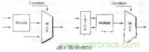 這 是一種在塊輸出不用時(shí)防止輸入信號(hào)使塊開(kāi)關(guān)工作的技巧。例如考慮一個(gè)乘法器,它的輸出僅在某些特定條件下才使用。在此場(chǎng)合可增添一個(gè)鎖存器,這樣每當(dāng)輸出 不用時(shí),乘法器的輸入將阻止不必要的開(kāi)關(guān)動(dòng)作帶入乘法器(圖4)。一個(gè)鎖存器只需一個(gè)組合單元,并不占用過(guò)多芯片面積。