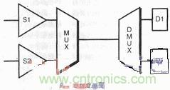 高 密度設(shè)計(jì)的布局必須留有空地并相當(dāng)?shù)卣归_(kāi),才可完成,這便導(dǎo)致連線(xiàn)長(zhǎng),每個(gè)線(xiàn)上開(kāi)關(guān)多,這些因素產(chǎn)生不良的時(shí)序結(jié)果并增加了功耗。此外,塊中的邏輯趨向于 分類(lèi)集結(jié)在一起,總線(xiàn)跨越不同塊時(shí)需走過(guò)較長(zhǎng)的距離。在一個(gè)設(shè)計(jì)中采用時(shí)分復(fù)用寬總線(xiàn)技術(shù),可減少總線(xiàn)的數(shù)量,有利于時(shí)序和功耗。再者,在DSP設(shè)計(jì)中, 數(shù)據(jù)是相關(guān)的,這表明大多數(shù)數(shù)據(jù)位并未改變狀態(tài)。攜帶相關(guān)數(shù)據(jù)的總線(xiàn)應(yīng)盡量復(fù)用在一起,進(jìn)一步減少M(fèi)UX、DEMUX邏輯中的開(kāi)關(guān)活動(dòng)(圖5)。