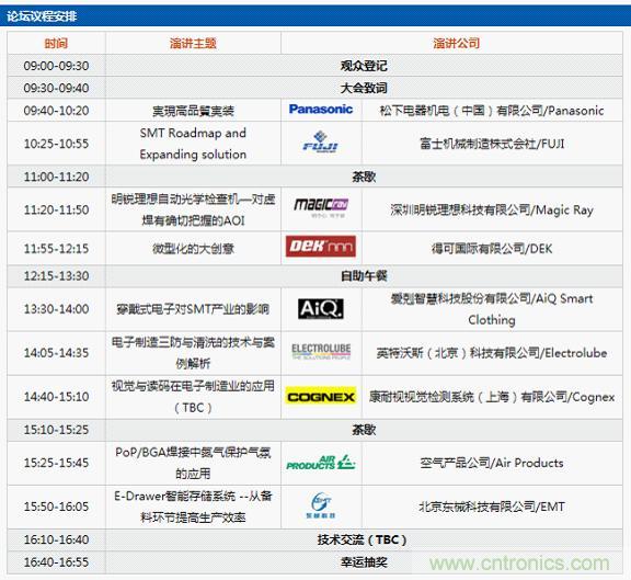 據(jù)主辦方介紹,為期一天的論壇將結(jié)合嘉賓演講和產(chǎn)品展示兩大形式為到場專業(yè)觀眾提供豐富的視聽體驗,更為電子制造設(shè)備/系統(tǒng)/方案使用者提供了深入了解供應(yīng)商“智”造服務(wù)的良好機會。在嘉賓演講版塊,主辦方邀請到來自Panasonic(松下)、Fuji(富士機械)、明銳理想、DEK(得可)、英特沃斯、康耐視、空氣產(chǎn)品、東械等涵蓋電子制造全產(chǎn)業(yè)鏈各生產(chǎn)環(huán)節(jié)的領(lǐng)先供應(yīng)商代表。在現(xiàn)場產(chǎn)品展示方面,與會觀眾更有機會近距離體驗來自Fuji(富士機械)、明銳理想、DEK(得可)、華普通用、英特沃斯、善思光電、章和電氣、首為國際(APOLLO SEIKO)、Praxair(普萊克斯)、東星科技、日本奧泰斯(OPTEX FA)等優(yōu)質(zhì)供應(yīng)商提供的先進技術(shù)及設(shè)備。