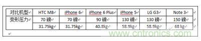此外,美國《消費者報告》利用三點式測試方案,將iPhone 5、iPhone 6、iPhone 6 Plus、HTC M8、LG G3以及三星Note 3手機懸空固定,并對機身中間部位施加壓力,計算上述手機變彎時所能承受的壓力上限。結果顯示(見表),iPhone 6/Plus和HTC M8的承受壓力最低(圖4),在受力達31kg左右時就會被壓彎,而表現(xiàn)最好的是Note 3,在68kg壓力時“防線”才會崩潰。