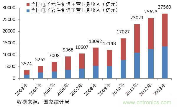 電子元器件是我國電子信息產(chǎn)業(yè)中的重要門類,產(chǎn)值比重約占電子信息產(chǎn)業(yè)的五分之一。2003-2013年,我國電子元器件行業(yè)增速迅猛,年復(fù)合增長達(dá)到了22.7%,從2003年的3574億元增長到2013年的2.76萬億元。其中,2013年電子器件制造和電子元件制造主營業(yè)務(wù)收入分別達(dá)到1.39萬億和1.36萬億元。