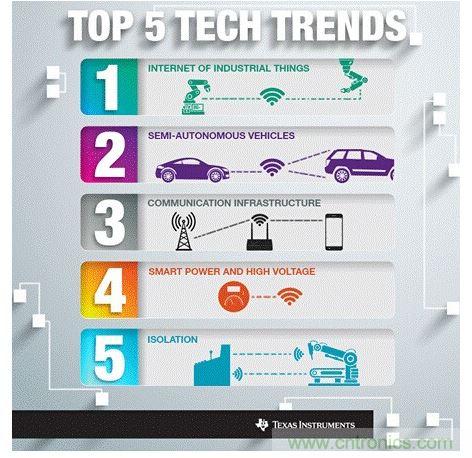 在迎接2015到來(lái)之際,我們有必要花時(shí)間來(lái)評(píng)估和預(yù)測(cè)未來(lái)的一年中將會(huì)出現(xiàn)的技術(shù)挑戰(zhàn)和突破創(chuàng)新。通過(guò)與眾多戰(zhàn)略客戶、大學(xué)合作伙伴以及TI產(chǎn)品線的技術(shù)專家進(jìn)行探討后,我們認(rèn)為T(mén)I將在一些重要技術(shù)趨勢(shì)中發(fā)揮戰(zhàn)略性作用。這些技術(shù)趨勢(shì)正推動(dòng)著汽車和工業(yè)等多個(gè)市場(chǎng)的發(fā)展,而在此過(guò)程中,TI的工程師將幫助應(yīng)對(duì)半導(dǎo)體技術(shù)領(lǐng)域的獨(dú)特挑戰(zhàn),并利用先進(jìn)技術(shù)改善我們的生活。