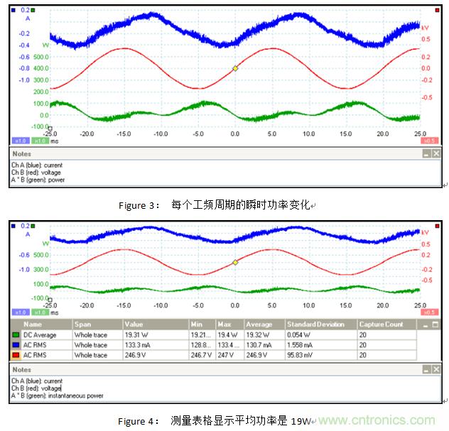 PR=19.32W,視在功率PA也是很容易計(jì)算的。它是由產(chǎn)品電流和電壓的RMS值來計(jì)算的。PA=0.1307A×246.9V≈32.27 W