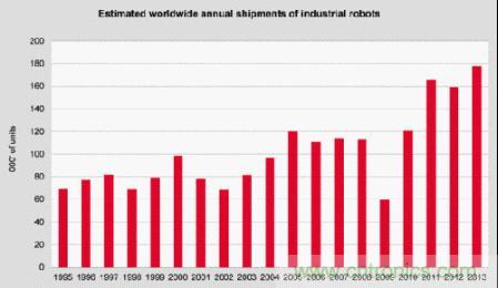 根據(jù)國(guó)際機(jī)器人聯(lián)盟(IFR)2014年統(tǒng)計(jì)顯示,2013年機(jī)器人出貨量增長(zhǎng)12%,成長(zhǎng)至178,132臺(tái),如圖1所示,工業(yè)機(jī)器人持續(xù)在汽車(chē)、化工、橡膠、塑料等行業(yè)以及食品行業(yè)增加;2008年至2013年,中國(guó)的工業(yè)機(jī)器人每年總供應(yīng)量平均增加36%,并且可促使該國(guó)成為世界最大的機(jī)器人市場(chǎng)。