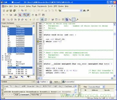 在程序窗口(包括C語言、匯編和反匯編窗口)中, 用鼠標(biāo)雙擊需要設(shè)置斷點(diǎn)的程序行,則在窗口左邊的狀態(tài)條中出現(xiàn)紅色的斷點(diǎn)標(biāo)志如圖2所示,完成設(shè)置斷點(diǎn)操作。再次用鼠標(biāo)雙擊該程序行,窗口左邊的紅色斷點(diǎn)標(biāo)志消失,則為刪除斷點(diǎn)操作。