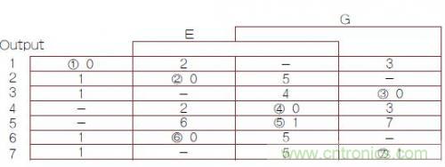 圖2:異步有限狀態(tài)機(FSM)轉(zhuǎn)換主表,其中1,2,3,4,5,6,7帶圈的數(shù)字是穩(wěn)定FSM狀態(tài)號(G是時鐘輸入)。