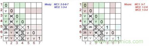 圖3:根據(jù)Mealy(左)和Moore(右)狀態(tài)機做出的最終表格對。