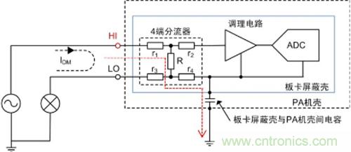 3.電流通道接入高端和低端,測量結(jié)果也不同,內(nèi)部板卡屏蔽殼與機殼間多少都會存在一些雜散電容(空間中兩個絕緣導(dǎo)體中存在電容),若電流通道接入高端,產(chǎn)生泄漏電流(圖3中紅色標記線),因此電流測量輸入應(yīng)當串在共模電壓較低的地方(低端)。