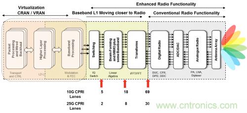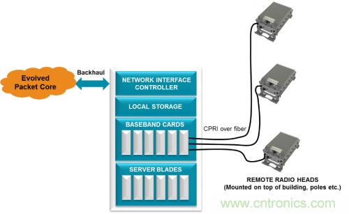 射頻單元位于緊鄰塔頂天線的位置,以避免功率損耗。這些遠(yuǎn)端射頻單元通過光纖連接至基帶 BTS 機(jī)架。制定的通用公共無線接口(CPRI) 協(xié)議用來傳輸數(shù)據(jù)和同步遠(yuǎn)端射頻。在有些無法使用光纖的情況下,使用微波或毫米波無線電來傳送 CPRI 有效負(fù)載。這種架構(gòu)轉(zhuǎn)變使運(yùn)營(yíng)商有望能夠混合使用和匹配來自不同系統(tǒng)廠商的無線電和基帶機(jī)架,以降低成本,改善供應(yīng)鏈,以及簡(jiǎn)化庫存管理。然而互操作性問題讓這種希望化為了泡影,不過為一級(jí)系統(tǒng)廠商開啟了新方法,使其能夠利用來自小廠商的無線電設(shè)備來控制針對(duì)不同地區(qū)的無線電設(shè)備種類的快速增長(zhǎng)。