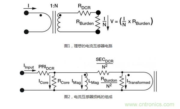 電流互感器(圖1)有三個突出優(yōu)點:與線電壓隔離,無損測量電流,大信號電壓能很好地抵御噪聲。這種間接測量電流的方法要求用到變化的電流,例如交流電,瞬變電流或開關(guān)式直流電,來產(chǎn)生一個磁耦合到次級繞組里的變化磁場。次級測量電壓可以根據(jù)在初級和次級繞組間的匝數(shù)比實現(xiàn)縮放。這種測量方法被認(rèn)為是“無損的”,因為電路電流通過銅繞組時的電阻損耗非常小。但是,如圖2所示,由于負(fù)載電阻、芯損,以及初級和次級直流電阻的存在,互感器的損耗會導(dǎo)致失去一小部分能量。