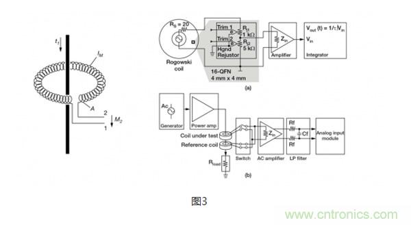 羅氏線圈(圖3)類似于電流互感器,會在次級線圈內(nèi)會感應(yīng)產(chǎn)生一個電壓,電壓大小與流經(jīng)隔離電感器的電流程正比。特殊之處在于,羅氏線圈采用的是氣芯設(shè)計,這一點與依賴層壓鋼等高磁導(dǎo)率鐵芯和次級繞組磁耦合的電流互感器完全不同。氣芯設(shè)計的電感較小,有更快的信號響應(yīng)和非常線性的信號電壓。由于采用了這種設(shè)計,羅氏線圈經(jīng)常被用在像手持電表這樣的已有接線上,臨時性地測量電流,可以認(rèn)為是電流互感器的低成本替代方案。