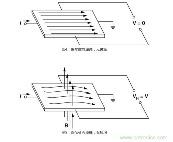 當(dāng)一個帶電流的導(dǎo)體被放進(jìn)磁場里時(圖4),在垂直于磁場和電流流動方向上會產(chǎn)生電位差。這個電位與電流大小成正比。在沒有磁場和電流流過時,就沒有電位差。但如圖5所示,當(dāng)有磁場和電流流過時,電荷與磁場相互作用,引起電流分布發(fā)生變化,這樣就產(chǎn)生了霍爾電壓。