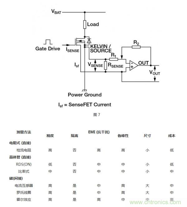 MOSFET由成千上萬個能降低導(dǎo)通電阻的并聯(lián)的晶體管元胞構(gòu)成。檢流MOSFET使用一少部分并聯(lián)元胞,連到共柵極和漏極,但源極是分開的(圖7)。這樣就產(chǎn)生了第2個隔離的晶體管,即“檢測”晶體管。當(dāng)晶體管導(dǎo)通時,流經(jīng)檢測晶體管的電流與流經(jīng)其他元胞的主電流成一定比例。
