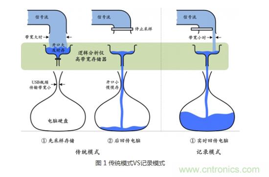 圖 1形象的詮釋了傳統(tǒng)模式和記錄模式的區(qū)別;當信號流很大時,直接存到細口瓶肯定溢出,只能先存到寬口瓶,存滿后先停下來,再慢慢傳回細口瓶;當信號流不大時,寬口瓶充當傳輸管,將信號流直接引入細口瓶,可長時間不間斷存儲。