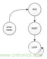 CPLD其內(nèi)部沒有RAM,這樣就不能依靠RAM的初始化數(shù)據(jù)來產(chǎn)生可靠的復(fù)位;從原理上說,器件上電后,其寄存器的狀態(tài)是不確定的,因此我們是沒法得到一個確定的初始狀態(tài)去產(chǎn)生一個可靠的內(nèi)部復(fù)位信號,不過我們還是可以產(chǎn)生一個有一定失敗概率但概率可控的復(fù)位信號,其基本原理是:設(shè)計一個n位的狀態(tài)機(jī),見下圖,其中一種狀態(tài)表示復(fù)位結(jié)束(記為LOOP),只要進(jìn)入該狀態(tài)就會一直保持在LOOP狀態(tài)上,至于其他狀態(tài)都會跳入復(fù)位狀態(tài)(記為RESET),RESET狀態(tài)是暫態(tài),一個時鐘周期就離開進(jìn)入LOOP狀態(tài);由于狀態(tài)LOOP出現(xiàn)的概率僅為:1/2n,我們控制n的長度,就可以將復(fù)位失敗概率控制在設(shè)定的要求內(nèi)。