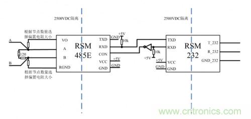 圖 2 簡(jiǎn)易隔離RS485中繼器方案一