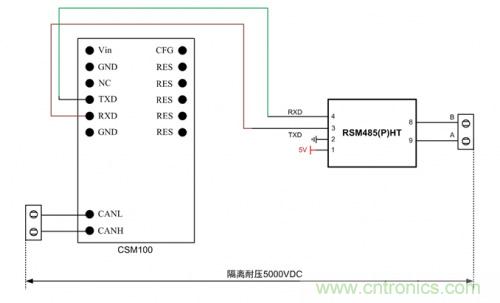 RS485和CAN雖然物理層都是差分傳輸,但因CAN多了更多的底層協(xié)議,兩者不能通過簡(jiǎn)單的方式直接轉(zhuǎn)換。此時(shí),使用如圖6所示的CSM100+RSM485模塊方式,利用CSM100能將CAN轉(zhuǎn)成UART數(shù)據(jù),再用RSM485PHT將UART轉(zhuǎn)成RS485電平,實(shí)現(xiàn)RS485轉(zhuǎn)CAN的功能。