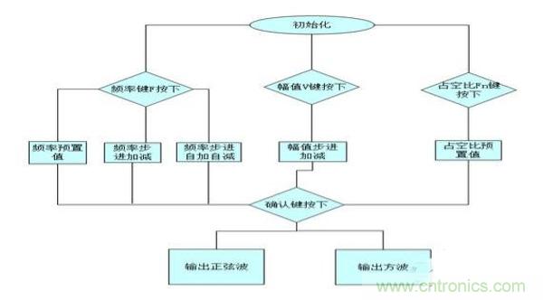 本系統(tǒng)要求在給定±15V電源電壓條件下設計出一個能產(chǎn)生正波和脈沖波的信號源。信號頻率為20Hz~20kHz,頻率能程控步進調(diào)整(步長為5Hz),脈沖波的占空比在2%~98%之間能程控步進調(diào)整(步長2%),兩路信號均要求幅值在100mv到3V步進可調(diào)(步長為100mv),要求性能良好(頻率穩(wěn)度高,非線性失真小等),方案考慮如下: