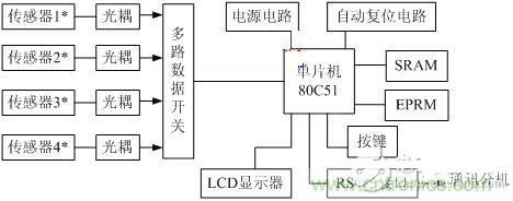 本文設(shè)計(jì)的壓力測(cè)量控制系統(tǒng)以80C51單片機(jī)為核心,包括傳感器、光耦6N139、數(shù)據(jù)開關(guān)74HC151、點(diǎn)陣式液晶顯示模塊EA-D20040AR, RS-485接口電路及高效電源電路等。測(cè)控系統(tǒng)接收到通訊分機(jī)傳來的數(shù)據(jù)采集命令后,采集四通道的壓力,傳給通訊分機(jī),再由通訊分機(jī)傳到地面, 實(shí)現(xiàn)了快速監(jiān)測(cè)處理和及時(shí)反饋信息。