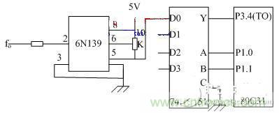 由圖2看出,傳感器頻率信號(hào)是通過光電耦合器6N139耦合到74HC151的輸入引腳D0。80C51的P1.0, P1.1輸出控制碼,選擇D0--D3輸入中的一路,用單片機(jī)的T0測(cè)信號(hào)頻率。