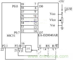 LCM點(diǎn)陣式液晶顯示模塊能顯示的字符多,并且能顯示漢字,因而在智能化測(cè)量控制儀表中得到了廣泛的應(yīng)用。本系統(tǒng)選用的是EPSON公司生產(chǎn)的EA-D20040AR點(diǎn)陣式液晶顯示模塊,它由TN型液晶顯示器、CMOS驅(qū)動(dòng)器和CMOS控制器組成,模塊內(nèi)集成有字符發(fā)生器和數(shù)據(jù)存貯器,采用單±5V電源供電,內(nèi)部有能顯示96個(gè)ASCII字符和92個(gè)特殊字符的字庫。EA-D20040AR與單片機(jī)80C51的接口電路如圖4所示: