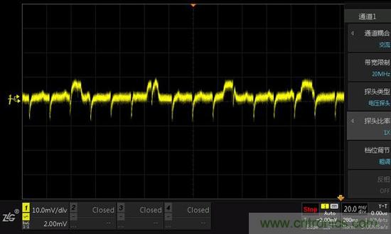 從圖5中可以看出,正確的紋波測量方式可以清晰的捕抓到正常的紋波,減少了不必要的噪聲和雜波對紋波的影響,基本上就是一條干凈的紋波了,在這樣的基礎(chǔ)上進行電源紋波測量,可以更精確的測量紋波的值,進而準(zhǔn)確估測電源質(zhì)量。