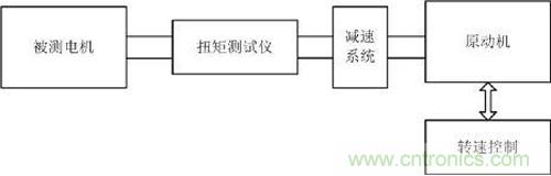 在國標(biāo)GBT/ 30549-2014里對齒槽轉(zhuǎn)矩的測試有了明確的定義:電機繞組開路時,電機回轉(zhuǎn)一周內(nèi),由電樞鐵心開槽,有趨于最小磁阻位置的傾向而產(chǎn)生的周期性力矩。齒槽轉(zhuǎn)矩的測試方法常用的有:杠桿測量法、轉(zhuǎn)矩儀法。杠桿測量法比較簡單,測量精度比較差,所以主要用于對精度要求不高的場合。轉(zhuǎn)矩儀法架構(gòu)圖如圖2所示,由于伺服電機的齒槽轉(zhuǎn)矩非常小,所以測試時需要以一個非常低的轉(zhuǎn)速來帶動未上電的被測電機來完成測試,原動機輸出后要先經(jīng)過減速系統(tǒng),將轉(zhuǎn)速降至1rpm/min左右,然后帶動被測電機進行測試,用扭矩