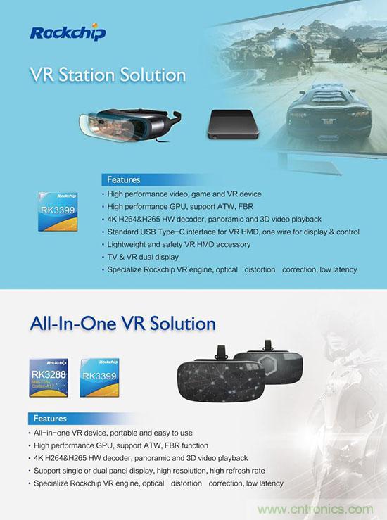 【導(dǎo)讀】本屆CES2017大展中VR全球產(chǎn)業(yè)熱度不減不增,全球硬件、平臺和內(nèi)容廠商蜂擁而至,Intel、NVIDIA、Qualcomm芯片商以及HTC、Oculus、SONY、三星、華為設(shè)備商均發(fā)布極具看點的新技術(shù)與旗艦機型。瑞芯微Rockchip本次展示了VR設(shè)備方案集群,方案從播放終端拓展至攝錄領(lǐng)域,成為VR新看點。