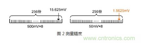 一般數(shù)字示波器采用的都是8位ADC,對(duì)任何一個(gè)波形值都是用256個(gè)0和1來(lái)重組。假設(shè)示波器垂直方向滿量程為8格,對(duì)應(yīng)量化級(jí)數(shù)256。在垂直檔位為500mV/div的情況下,垂直精度為(500mV*8)/256=15.625 mV。測(cè)量同一個(gè)信號(hào),在垂直檔位為50mV/div的情況下,即(50mV*8)/256=1.5625 mV,垂直精度就達(dá)到了1.5625 mV。