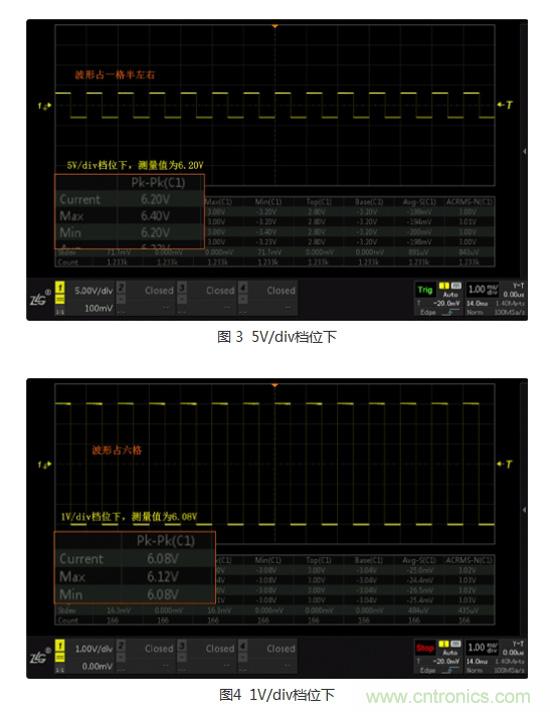 當(dāng)波形占屏幕1.5格時(shí),所測(cè)的峰峰值為6.20V,相差1個(gè)分辨率,相對(duì)6V的峰峰值誤差為3.3%。