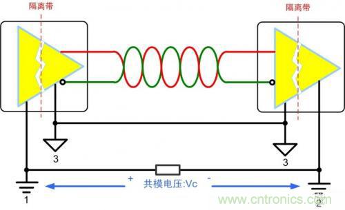 隔離收發(fā)器可將總線和控制電路進(jìn)行電氣隔離,將高壓阻擋在控制系統(tǒng)之外,可以有效地保證操作人員的人身及系統(tǒng)安全。不僅如此,隔離可以抑制由接地電勢(shì)差、接地環(huán)路引起的各種共模干擾,保證總線在嚴(yán)重干擾和其它系統(tǒng)級(jí)噪聲存在的情況下不間斷、無差錯(cuò)運(yùn)行。如圖 1所示,使用隔離收發(fā)器后,可以有效防止形成地環(huán)路,總線參考地可跟隨共模電壓的波動(dòng)而波動(dòng),共模電壓全部由隔離帶承受,共模電壓對(duì)總線信號(hào)變得不再可見,從而保證總線穩(wěn)定可靠地通信。