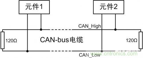 電纜上傳輸時(shí),當(dāng)阻抗不連續(xù)或者發(fā)生突變時(shí),就會(huì)發(fā)生信號(hào)反射。反射的過程十分的復(fù)雜,甚至可能發(fā)生多次反射,反射的信號(hào)疊加在正常的信號(hào)上,引起電平變化,導(dǎo)致數(shù)據(jù)傳輸出現(xiàn)錯(cuò)誤。為了消減這種信號(hào)反射的方法,我們是使傳輸電纜上的阻抗保持連續(xù),但是電纜總是有終點(diǎn)的,終點(diǎn)的阻抗是突變的,為了使終點(diǎn)阻抗保持連續(xù),CAN-Bus規(guī)定要在電纜兩端接入匹配電阻。這個(gè)終端電阻的阻值一般選用120Ω。如圖 3所示。