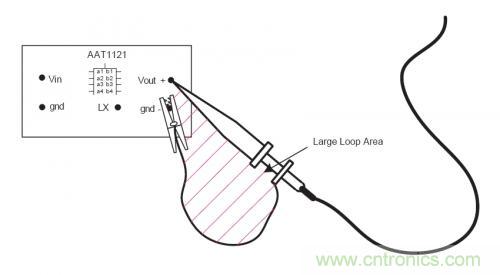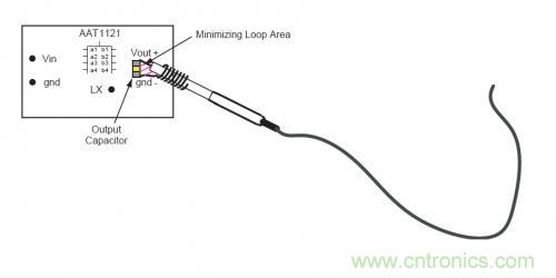在測(cè)量中,如何減小拾取的輻射噪聲?最簡(jiǎn)單可靠的方法是采用一個(gè)接地環(huán)來(lái)測(cè)量電源紋波以及噪聲。為了進(jìn)一步的降低測(cè)試誤差,可以將示波器探頭和地線直接放在電源輸出電容得兩端。如下圖所示,采用這種方法,在信號(hào)探頭和地線之間的環(huán)路面積很小,所以測(cè)量中帶來(lái)誤差的噪聲幾乎可以忽略。
