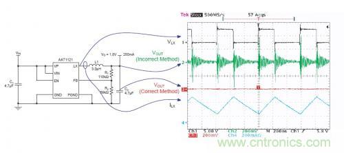 下圖描述了采用兩個(gè)不同的測(cè)試方法得到的Vout波形。電源電路是一個(gè)BUCK轉(zhuǎn)換電路(AAT1121),工作在1.5MHz的開關(guān)頻率,輸出電壓為1.8V/250mA。示波器采用全帶寬測(cè)試??梢钥吹桨殡S著PWM開關(guān),在綠色的trace2有一個(gè)很高的噪音以及振鈴,但是trace3上卻沒有明顯的噪聲。通過(guò)對(duì)比可以看到,測(cè)試方法的選擇對(duì)結(jié)果的準(zhǔn)確性很關(guān)鍵。