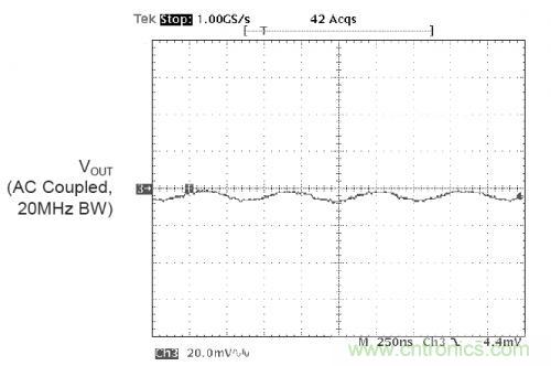 下圖是采用20MHz帶寬限制測(cè)試到的電源的紋波以及噪聲。示波器20MHz的帶寬限制是為了防止無(wú)源探頭帶入的共模噪聲??梢钥吹紸AT1121BUCK轉(zhuǎn)換器的紋波噪聲為10mVp-p,幾乎看不到開關(guān)噪聲。這主要是歸功于BUCK控制器的低噪聲設(shè)計(jì),良好的PCB設(shè)計(jì),以及恰當(dāng)?shù)臏y(cè)試方法。