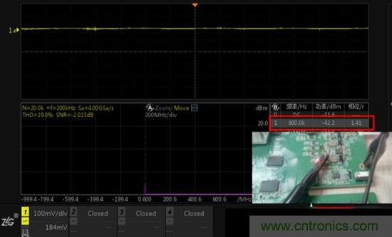 注:通道1信號幅度雖然非常小,但通過FFT分析還是可以定位出600K頻點(diǎn)的干擾。