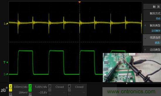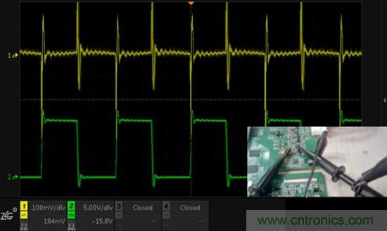 圖3.CH1使用夾子測量電源輸出,CH2使用夾子測量電感,單點(diǎn)接地
