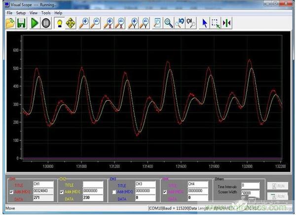 LDO本身的電壓輸出非常穩(wěn)定,由于筆者ADC采樣為10位,在手指未放入傳感器時,電壓值幾乎保持在3/1024以內(nèi)跳動。所以筆者默認(rèn)這款LDO能達(dá)0.3%以下的精度。下圖便是筆者關(guān)于LDO給模擬部分供電后的心率采樣波形。紅色為一階低通濾波前的波形,黃色為低通濾波后的波形。對實時性要求不高的系統(tǒng)來說,這樣的模擬量波形已經(jīng)能夠滿足項目的需求。