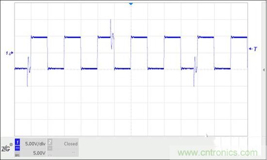 調(diào)試中發(fā)現(xiàn),驅動器上電但未開啟輸出,電機轉軸處于自由靜止狀態(tài),測量到一個較大的值。用示波器測量傳感器輸出,發(fā)現(xiàn)100kHz脈沖上每個幾個周期出現(xiàn)一些尖峰振蕩,經(jīng)過比較器后多了些脈沖,導致測頻結果高于100kHz。那么干擾信號從何而來?首先懷疑是驅動器,驅動器斷電干擾消失。把傳感器電纜從傳感器處拔出,100kHz和干擾都沒有了。證明干擾由驅動器產(chǎn)生,通過驅動器輸出線、電機、扭矩傳感器及連線耦合到功率分析儀。
