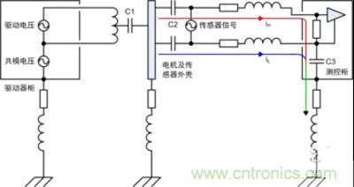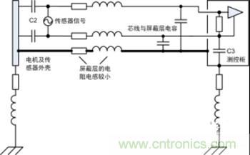 4)此處電機平臺和測控柜已有接地,通過傳感器連接線屏蔽層又將兩者連接,形成地環(huán)路。然而實際工程應用中地環(huán)路往往不可避免地存在,本例中若沒有屏蔽層依然會通過C2、電纜和C3產(chǎn)生高頻地環(huán)路,從這方面看屏蔽層改變了環(huán)路路徑。