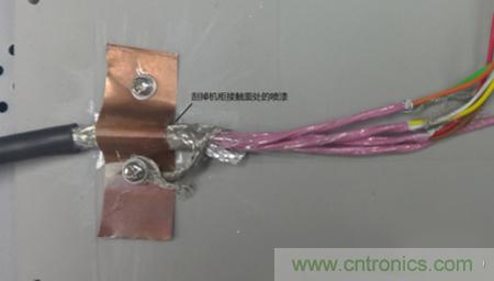 從安全方面考慮,三個機柜都必須接大地,強電線路與信號線分開避免干擾這些都是要遵循的基本原則。實際機柜間位置較遠,接地對于高頻干擾改善不多,只作為安全措施。解決這種問題一般考慮是從干擾源、傳播路徑、敏感設備三方面著手。驅動器和功率分析儀是成型的設備,不便于改動,考慮從傳播路徑入手,使用多芯屏蔽電纜連接扭矩傳感器到測控柜,傳感器端屏蔽層連接到傳感器外殼,也與電機平臺連通,另一側屏蔽層接到測控柜機殼。最初的時候屏蔽層通過一根較長的線連接到測控柜,發(fā)現(xiàn)并沒有改善,最后使用銅片將整根線壓到機柜,干擾得到很大衰減。