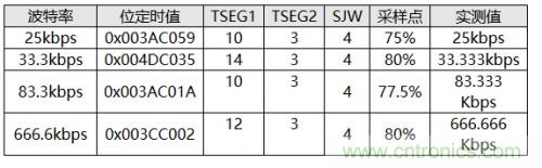 通過(guò)對(duì)波特率計(jì)算器計(jì)算出來(lái)的波特率寄存器設(shè)置參數(shù)進(jìn)行驗(yàn)證,發(fā)現(xiàn)測(cè)試結(jié)果跟我們的預(yù)期結(jié)果一致,因此在使用特殊波特率時(shí),我們可以借助波特率計(jì)算器來(lái)快速計(jì)算出位定時(shí)寄存器的參數(shù)值。下面我們給出一些可參考的特殊波特率的參數(shù):