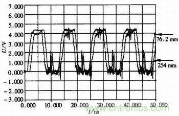 在高速數(shù)字電路的設(shè)計(jì)中,除了阻抗匹配外,部分器件對(duì)傳輸線(xiàn)的長(zhǎng)度有著嚴(yán)格的要求,信號(hào)頻率越高,要求傳輸線(xiàn)的長(zhǎng)度越短。以X1器件和X2器件為例建立仿真模型如圖3所示。在仿真模型中加了33Ω的匹配電阻,選擇仿真信號(hào)頻率為66MHz方波,改變傳輸線(xiàn)長(zhǎng)度分別為76.2mm和254mm時(shí)進(jìn)行仿真。仿真結(jié)果如圖4所示。