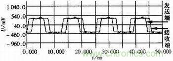 在實(shí)際的PCB布線(xiàn)時(shí),如果由于產(chǎn)品結(jié)構(gòu)的需要,不能縮短信號(hào)線(xiàn)長(zhǎng)度時(shí),應(yīng)采用差分信號(hào)傳輸。差分信號(hào)有很強(qiáng)的抗共模干擾能力,能大大延長(zhǎng)傳輸距離。差分信號(hào)有很多種,如ECL、PECL、LVDS等,表1列出LVDS相對(duì)于ECL、PECL系統(tǒng)的主要特點(diǎn)。LVDS的恒流源模式低擺幅輸出使得LVDS能高速驅(qū)動(dòng),對(duì)于點(diǎn)到的連接,傳輸速率可達(dá)800Mbps,同時(shí)LVDS低噪聲、低功耗,連接方便,實(shí)際中使用較多。LVDS的驅(qū)動(dòng)器由一個(gè)通常為3.5mA的恒流源驅(qū)動(dòng)對(duì)差分信號(hào)線(xiàn)組成。接收端有一個(gè)高的直流輸入阻抗,幾科全部的驅(qū)動(dòng)電流流經(jīng)10Ω的終端電阻,在接收器輸入端產(chǎn)生約350mV電壓。當(dāng)驅(qū)動(dòng)狀態(tài)反轉(zhuǎn)時(shí),流經(jīng)電阻的電流方向改變,此時(shí)在接收端產(chǎn)生有效的邏輯狀態(tài)。圖5是利用LVDS芯片DS90LV031、DS90LV032把信號(hào)轉(zhuǎn)換成差分信號(hào),進(jìn)行長(zhǎng)距離傳輸?shù)牟ㄐ螆D。在仿真時(shí)設(shè)置仿真頻率為66MHz理想方波,傳輸距離為508mm,差分對(duì)終端接100Ω負(fù)載匹配傳輸線(xiàn)的差分阻抗。從仿真結(jié)果看,LVDS接收端的波形除了有延遲外,波形保持完好。
