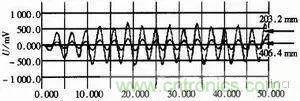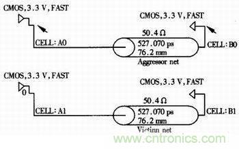 由于頻率的提高,傳輸線(xiàn)之間的串?dāng)_明顯增大,對(duì)信號(hào)完整性也有很大的影響,可以通過(guò)仿真來(lái)預(yù)測(cè)、模擬,并采取措施加以改善。以CMOS信號(hào)為例建立仿真模型,如圖6所示。在仿真時(shí)設(shè)置干擾信號(hào)的頻率為66MHz的方波,被干擾者設(shè)置為零電平輸入,通過(guò)調(diào)整兩根線(xiàn)的間距和兩線(xiàn)之間平行走線(xiàn)的長(zhǎng)度來(lái)觀(guān)察被干擾者接收端的波形。仿真結(jié)果如圖7,分別為間距是203.2mm、406。4mm時(shí)的波形。