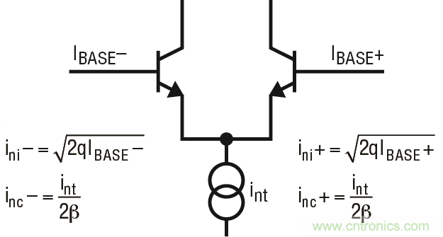 就寬帶噪聲而論,兩個輸入晶體管均具有與其基極相關(guān)聯(lián)的點噪聲 (ini- 和 ini+),這些點噪聲是不相干的。來自位于輸入對尾部之電流源的噪聲 (int) 還產(chǎn)生了在兩個輸入之間劃分的相干噪聲 (在每個輸入中為 int/2β)。如果兩個輸入上承載的電阻相等,則每個輸入上的相干電壓噪聲也是相等的,并且抵消 (根據(jù)放大器的共模抑制能力),因而留下的主要是不相干噪聲。這在產(chǎn)品手冊中被列為平衡電流噪聲。如果兩個輸入上的電阻極大地失配,則相干和不相干噪聲分量保留,而且電壓噪聲以平方根之和相加。這在有些產(chǎn)品手冊中列為不平衡噪聲電流。