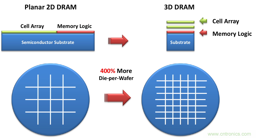 圖2:3D DRAM可讓每片晶圓切出更多的芯片與低成本DRAM。