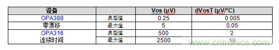 表1顯示了連續(xù)時間和零漂移放大器的Vos和dVos/dT的比較。請注意,零漂移放大器的Vos和dVos/dT要小三個數(shù)量級。